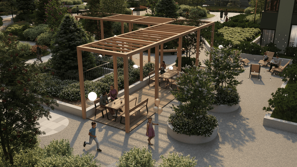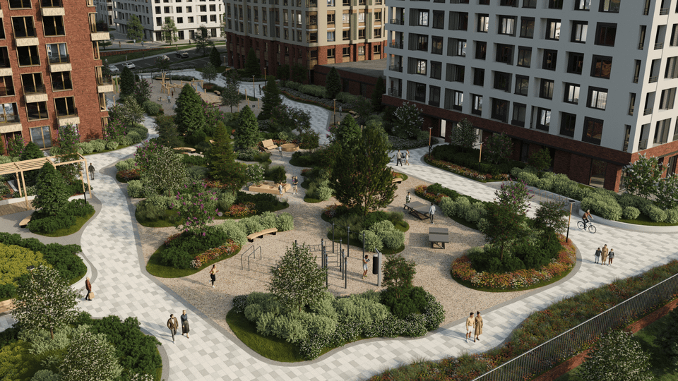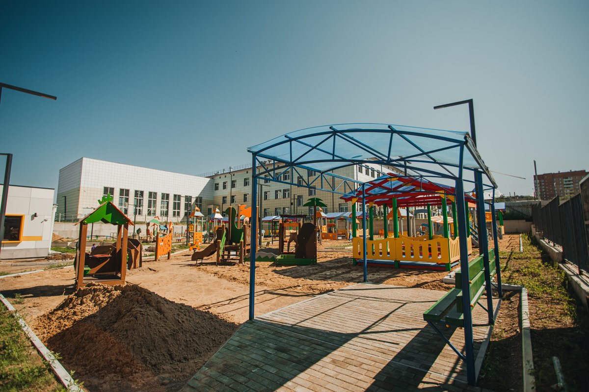 На внутренней территории комплекса находятся детский сад и школа — дети останутся под присмотром, а дорога займет всего пару минут.