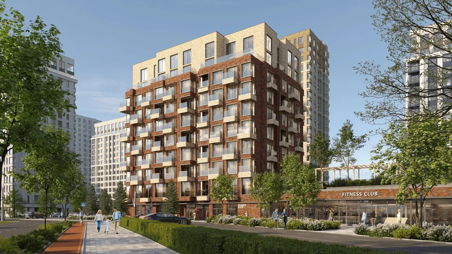 На внутренней территории комплекса находятся детский сад и школа — дети останутся под присмотром, а дорога займет всего пару минут.